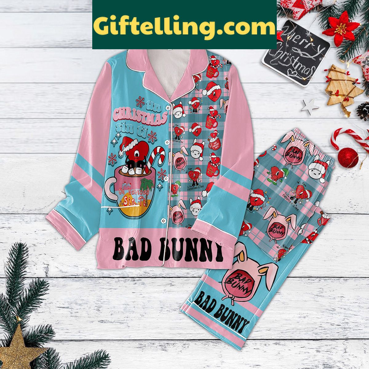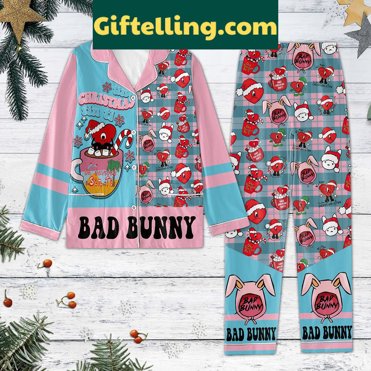 Order your Bad Bunny Un Christmas Sin Ti Pajamas Set: Cozy Holiday Nights at Giftelling! ❤️