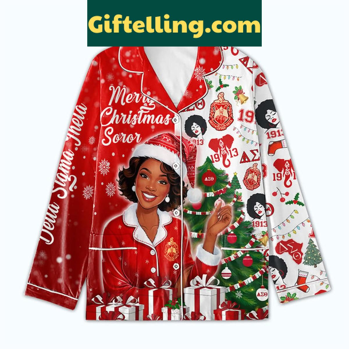 Get cozy with the Delta Sigma Theta Merry Christmas Soror 2024 Polyester Pajamas Set, perfect for festive sorority nights and holiday lounging.