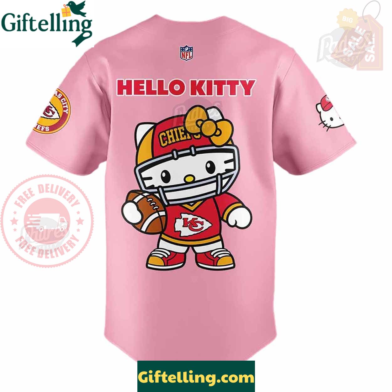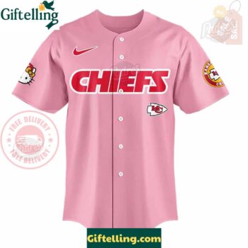 Order your Kansas City Chiefs Hello Kitty Pink Baseball Jersey Outfit at Giftelling! ❤️