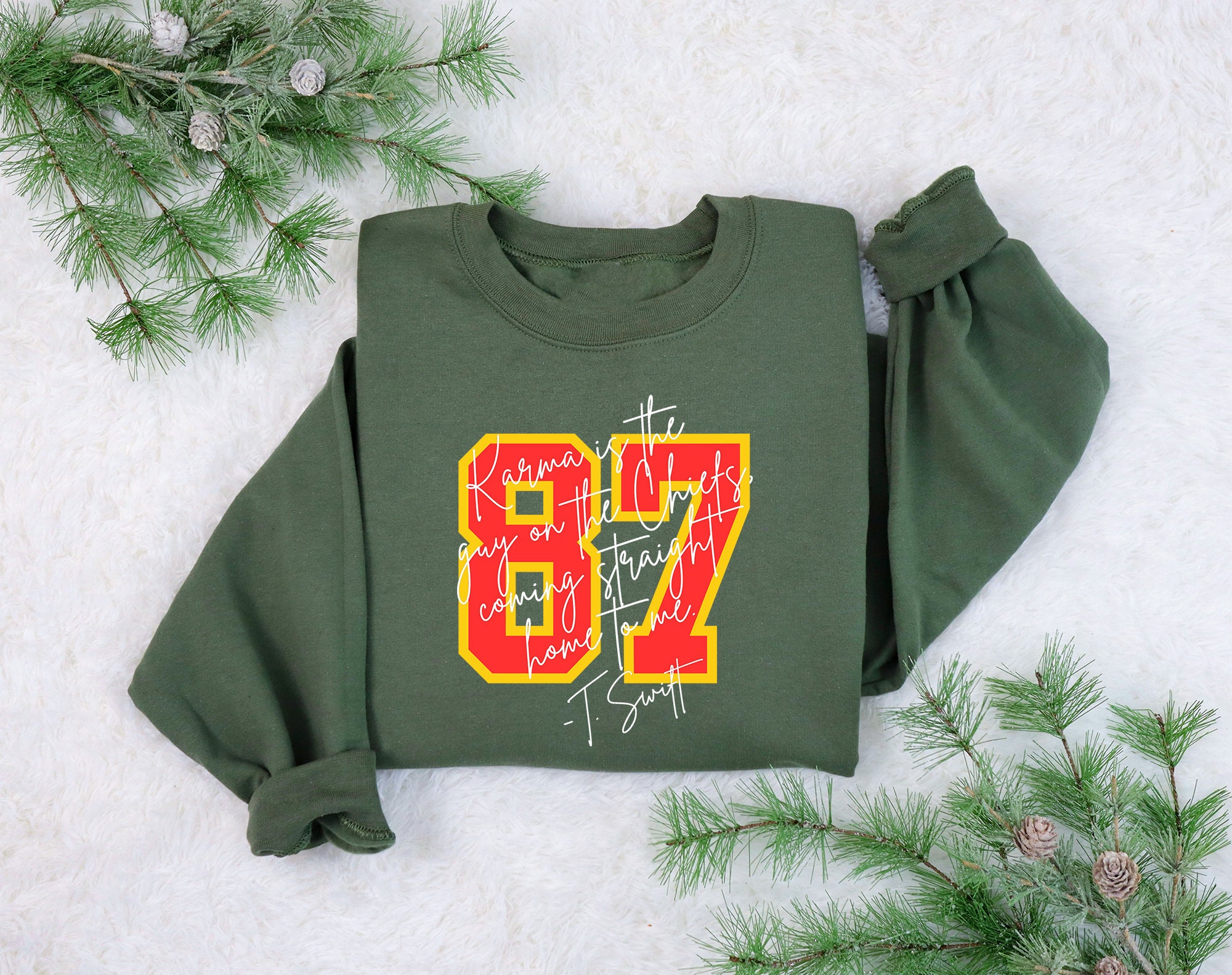 Are you ready to show your love for the most talked-about duo in pop culture and NFL? Look no further than our exclusive "Karma Is The Guy On The Chiefs" sweatshirt! This cozy and stylish top is the perfect way to celebrate the iconic connection between Taylor Swift and Travis Kelce, making it an absolute must-have for Swifties and Chiefs Kingdom alike.