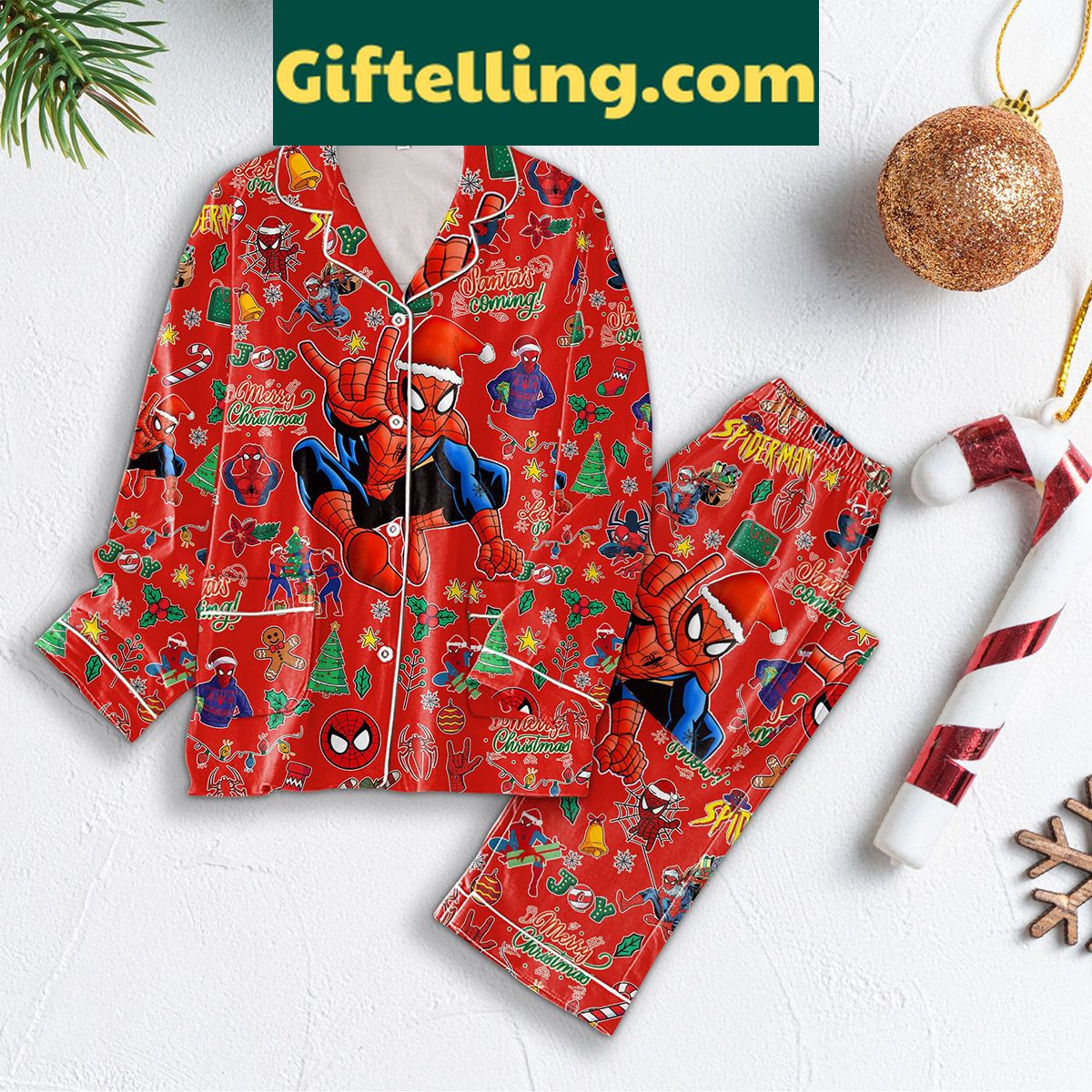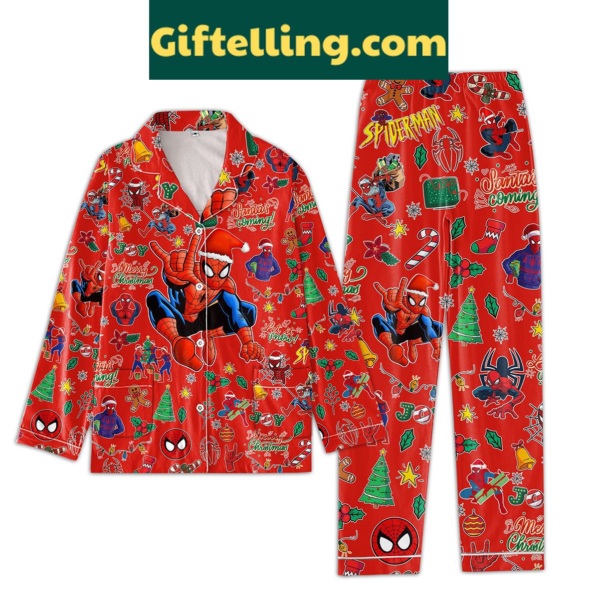 Order your Marvel Spiderman Homecoming Santa Is Coming Merry Christmas Silk Pajamas Set for Kids and Adults at Giftelling! ❤️