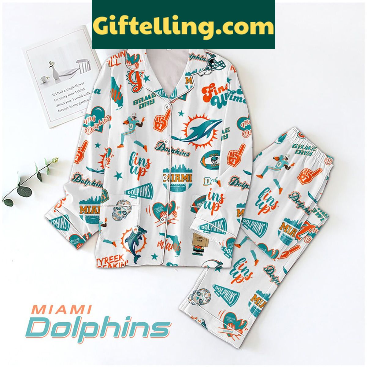 Order your Miami Dolphins Fins Up Game Day Pajamas Set for Football Fans at Giftelling! ❤️