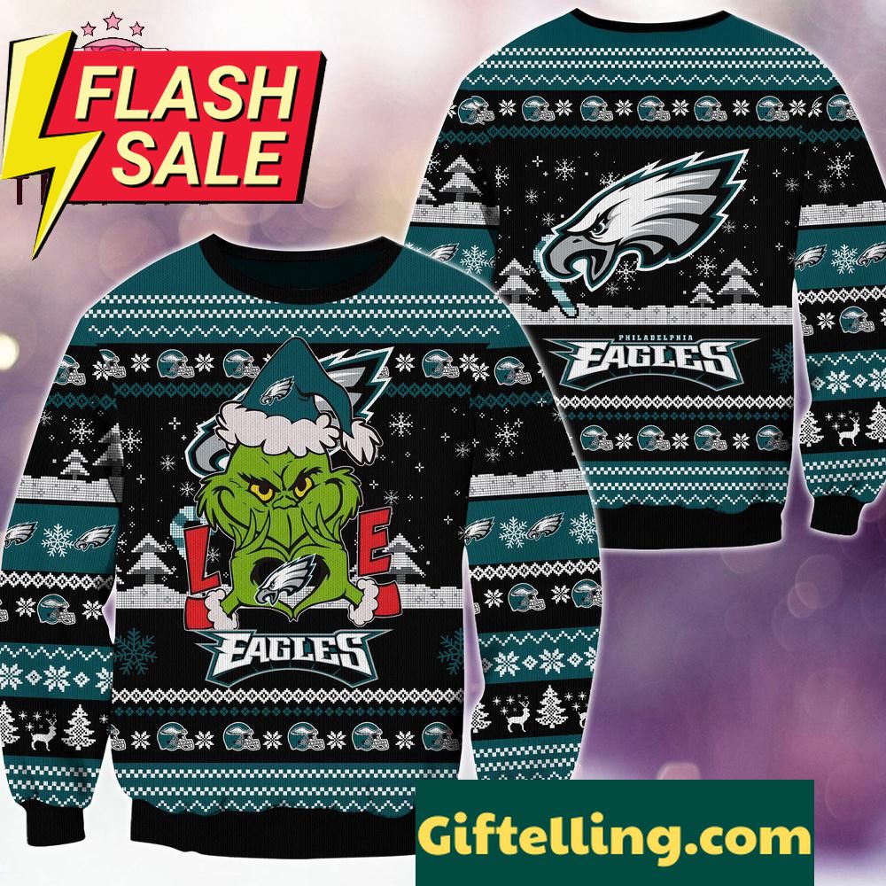 Ready to elevate your holiday style? Visit Giftelling.com today to get your hands on the NFL Philadelphia Eagles x Grinch Movies Ugly Christmas Sweater and make this holiday season one to remember!