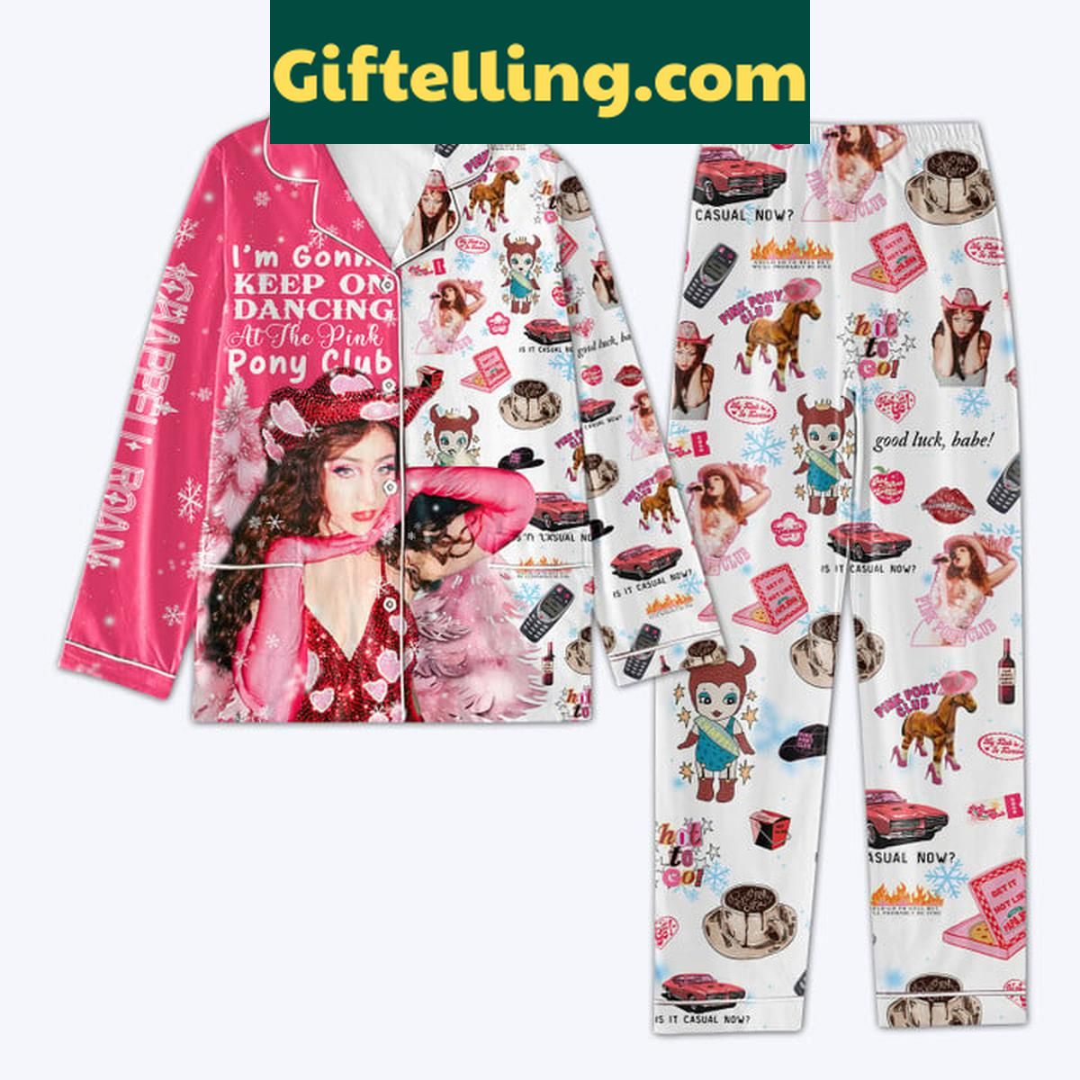 Get the Chappell Roan I’m Going Keep On Dancing At The Pink Pony Club Polyester Pajamas Set for a cozy night in with a touch of personality.