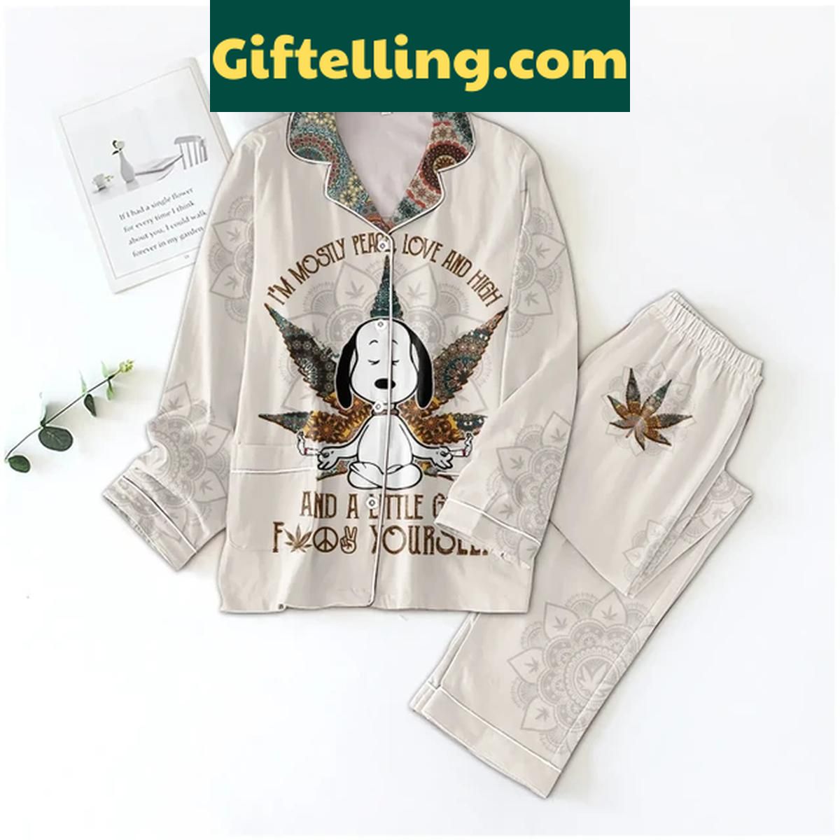 Visit Giftelling.com to get your hands on this one-of-a-kind Snoopy I'm Mostly Peace Love And High And A Little Go F Yourself Polyester Pajamas Set and elevate your loungewear game!